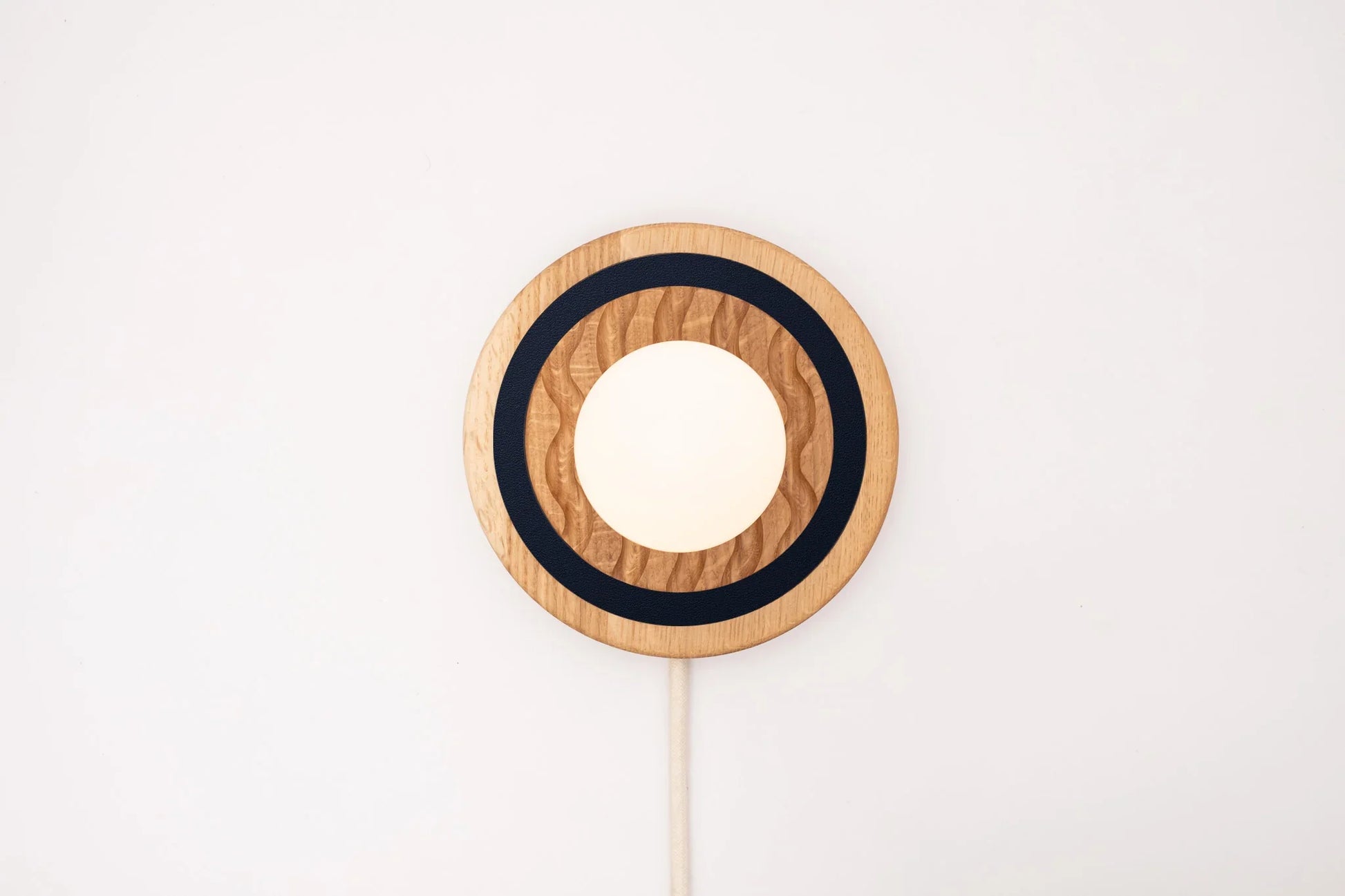 Inspired by the natural patterns of sand ripples, this handcrafted wall sconce features a leather inlay and a smooth dial dimmer. Available in various wood and leather combinations to suit any space.